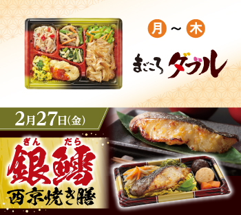 - ●2月23日週の5日間コース・7日間コースの金曜日(2月27日)のお弁当・お惣菜を「銀鱈西京焼き膳」に変更いただけます。