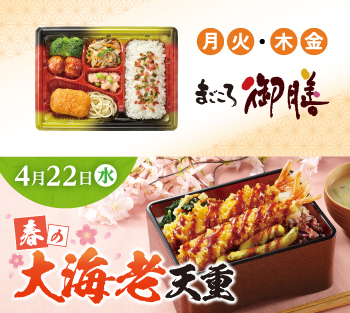 ●4月20日週の5日間コース・7日間コースの水曜日(4月22日)のお弁当・お惣菜を「春の大海老天重」に変更いただけます。