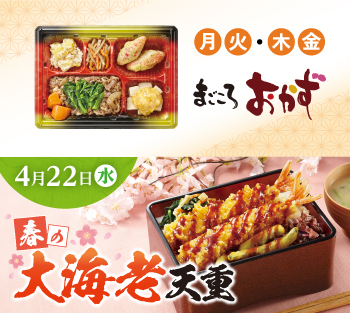 - ●4月20日週の5日間コース・7日間コースの水曜日(4月22日)のお弁当・お惣菜を「春の大海老天重」に変更いただけます。