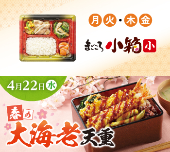 - ●4月20日週の5日間コース・7日間コースの水曜日(4月22日)のお弁当・お惣菜を「春の大海老天重」に変更いただけます。