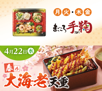 ●4月20日週の5日間コース・7日間コースの水曜日(4月22日)のお弁当・お惣菜を「春の大海老天重」に変更いただけます。