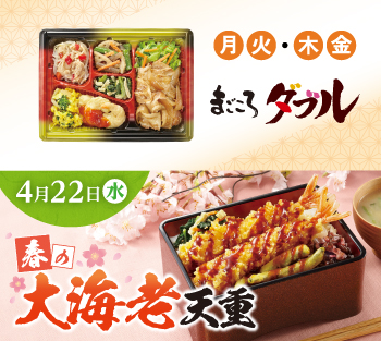 ●4月20日週の5日間コース・7日間コースの水曜日(4月22日)のお弁当・お惣菜を「春の大海老天重」に変更いただけます。